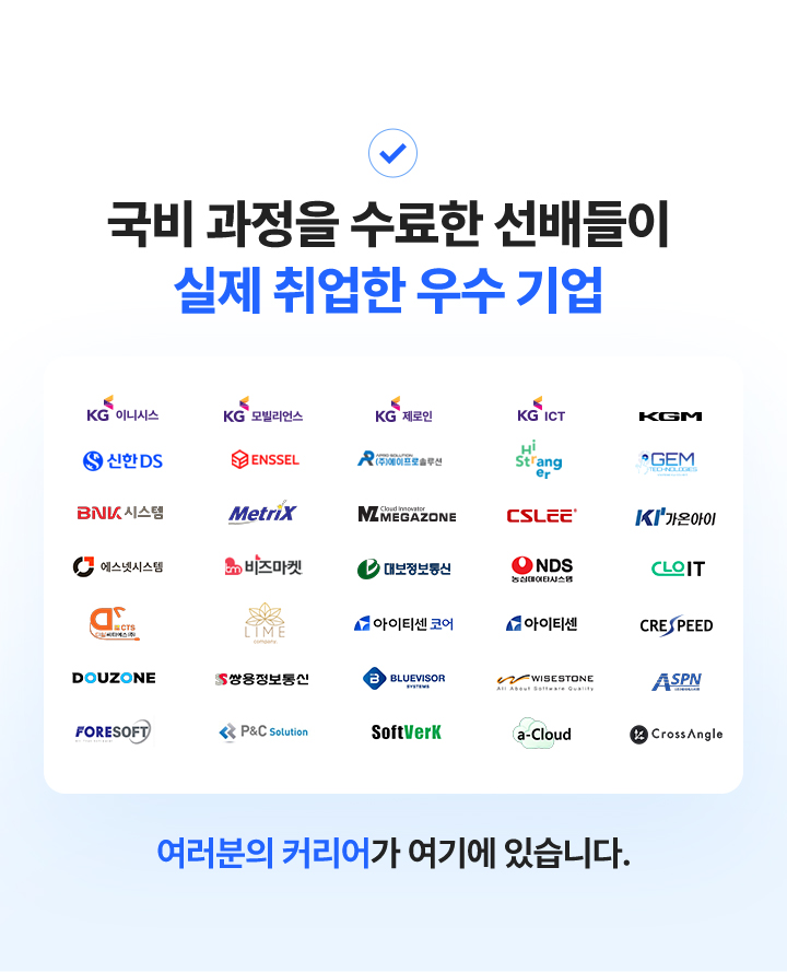 과정중에는 취업지원상담, 취업특강이 진행되며, 과정 수료 후에는 6개월간 사후취업관리를 받으실 수 있습니다.